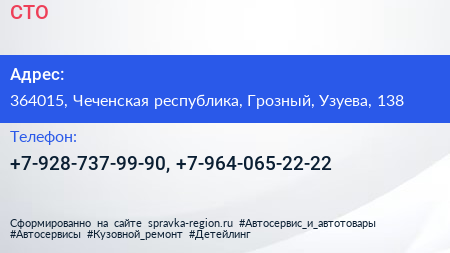 СТО по адресу 364015, Чеченская республика, Грозный, Узуева, 138 в дальнейшем Организация, размещена в следующих категориях: