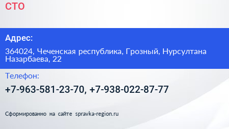 СТО по адресу 364024, Чеченская республика, Грозный, Нурсултана Назарбаева, 22 в дальнейшем Организация, размещена в следующих категориях: