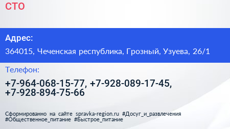 СТО по адресу 364015, Чеченская республика, Грозный, Узуева, 26/1 в дальнейшем Организация, размещена в следующих категориях: