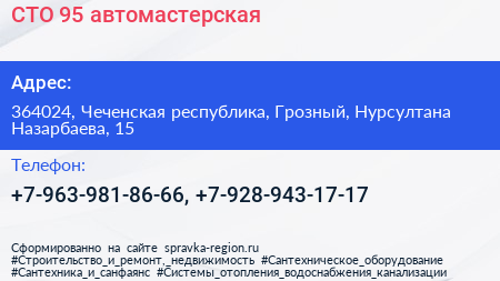 СТО 95, автомастерская по адресу 364024, Чеченская республика, Грозный, Нурсултана Назарбаева, 15 в дальнейшем Организация, размещена в следующих категориях: