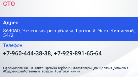 СТО по адресу 364060, Чеченская республика, Грозный, Эсет Кишиевой, 54/2 в дальнейшем Организация, размещена в следующих категориях: