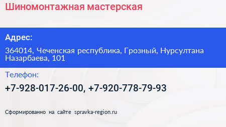 Шиномонтажная мастерская по адресу 364014, Чеченская республика, Грозный, Нурсултана Назарбаева, 101 в дальнейшем Организация, размещена в следующих категориях: