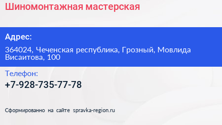 Шиномонтажная мастерская по адресу 364024, Чеченская республика, Грозный, Мовлида Висаитова, 100 в дальнейшем Организация, размещена в следующих категориях: