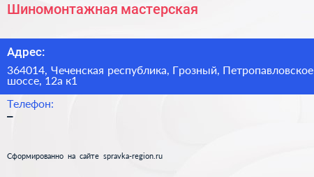 Шиномонтажная мастерская по адресу 364014, Чеченская республика, Грозный, Петропавловское шоссе, 12а к1 в дальнейшем Организация, размещена в следующих категориях: