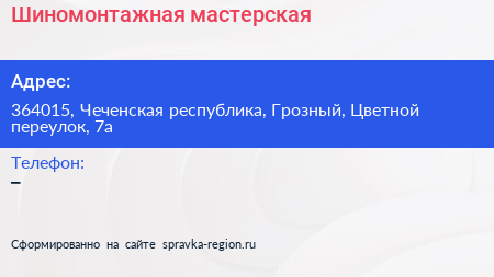 Шиномонтажная мастерская по адресу 364015, Чеченская республика, Грозный, Цветной переулок, 7а в дальнейшем Организация, размещена в следующих категориях: