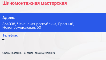 Шиномонтажная мастерская по адресу 364038, Чеченская республика, Грозный, Новопромысловая, 50 в дальнейшем Организация, размещена в следующих категориях:
