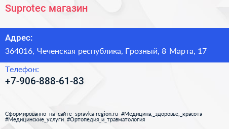 Suprotec, магазин по адресу 364016, Чеченская республика, Грозный, 8 Марта, 17 в дальнейшем Организация, размещена в следующих категориях: