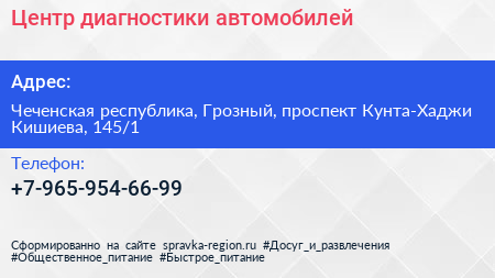 Центр диагностики автомобилей по адресу Чеченская республика, Грозный, проспект Кунта-Хаджи Кишиева, 145/1 в дальнейшем Организация, размещена в следующих категориях: