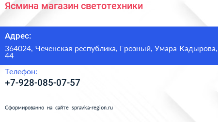 Ясмина, магазин светотехники по адресу 364024, Чеченская республика, Грозный, Умара Кадырова, 44 в дальнейшем Организация, размещена в следующих категориях: