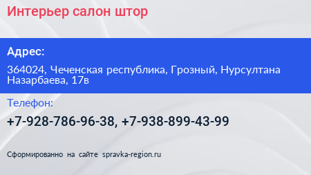 Интерьер, салон штор по адресу 364024, Чеченская республика, Грозный, Нурсултана Назарбаева, 17в в дальнейшем Организация, размещена в следующих категориях: