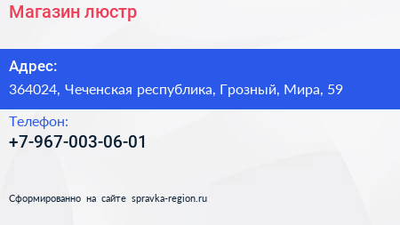 Магазин люстр по адресу 364024, Чеченская республика, Грозный, Мира, 59 в дальнейшем Организация, размещена в следующих категориях: