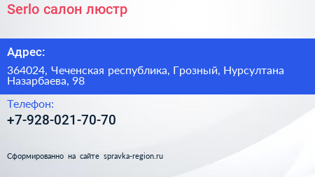Serlo, салон люстр по адресу 364024, Чеченская республика, Грозный, Нурсултана Назарбаева, 98 в дальнейшем Организация, размещена в следующих категориях: