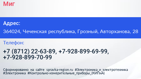 Миг по адресу 364024, Чеченская республика, Грозный, Авторханова, 28 в дальнейшем Организация, размещена в следующих категориях: