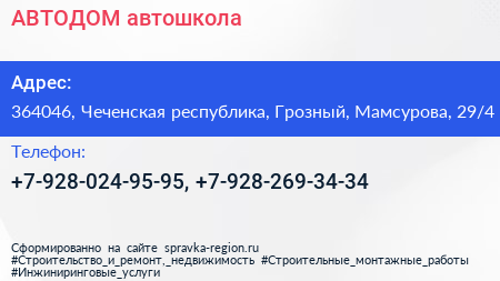 АВТОДОМ, автошкола по адресу 364046, Чеченская республика, Грозный, Мамсурова, 29/4 в дальнейшем Организация, размещена в следующих категориях: