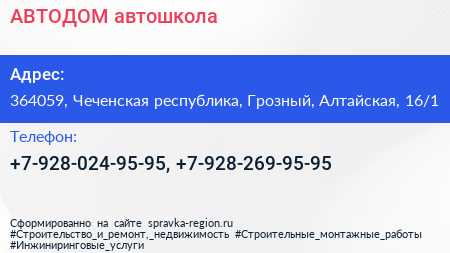 АВТОДОМ, автошкола по адресу 364059, Чеченская республика, Грозный, Алтайская, 16/1 в дальнейшем Организация, размещена в следующих категориях: