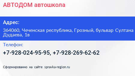 АВТОДОМ, автошкола по адресу 364060, Чеченская республика, Грозный, бульвар Султана Дудаева, 1в в дальнейшем Организация, размещена в следующих категориях: