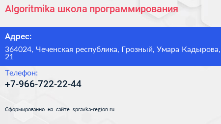 Algoritmika, школа программирования по адресу 364024, Чеченская республика, Грозный, Умара Кадырова, 21 в дальнейшем Организация, размещена в следующих категориях: