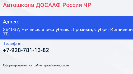 Автошкола, ДОСААФ России ЧР по адресу 364037, Чеченская республика, Грозный, Субры Кишиевой, 7Б в дальнейшем Организация, размещена в следующих категориях: