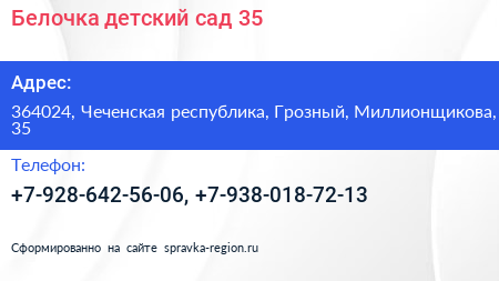 Белочка, детский сад №35 по адресу 364024, Чеченская республика, Грозный, Миллионщикова, 35 в дальнейшем Организация, размещена в следующих категориях: