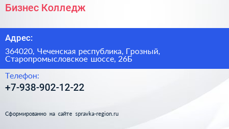 Бизнес Колледж по адресу 364020, Чеченская республика, Грозный, Старопромысловское шоссе, 26Б в дальнейшем Организация, размещена в следующих категориях: