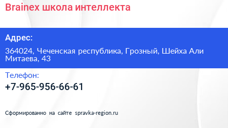 Brainex, школа интеллекта по адресу 364024, Чеченская республика, Грозный, Шейха Али Митаева, 43 в дальнейшем Организация, размещена в следующих категориях: