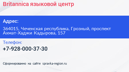 Britannica, языковой центр по адресу 364015, Чеченская республика, Грозный, проспект Ахмат-Хаджи Кадырова, 157 в дальнейшем Организация, размещена в следующих категориях:
