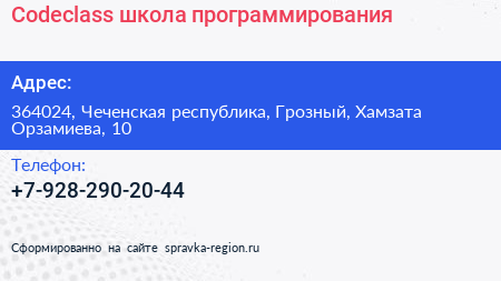 Codeclass, школа программирования по адресу 364024, Чеченская республика, Грозный, Хамзата Орзамиева, 10 в дальнейшем Организация, размещена в следующих категориях:
