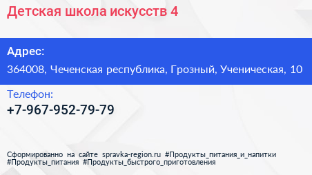 Детская школа искусств №4 по адресу 364008, Чеченская республика, Грозный, Ученическая, 10 в дальнейшем Организация, размещена в следующих категориях: