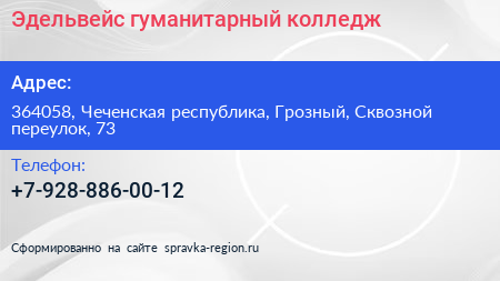 Эдельвейс, гуманитарный колледж по адресу 364058, Чеченская республика, Грозный, Сквозной переулок, 73 в дальнейшем Организация, размещена в следующих категориях:
