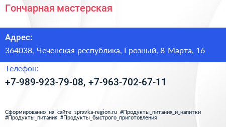 Гончарная мастерская по адресу 364038, Чеченская республика, Грозный, 8 Марта, 16 в дальнейшем Организация, размещена в следующих категориях: