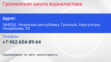 Грозненская школа журналистики по адресу 364024, Чеченская республика, Грозный, Нурсултана Назарбаева, 92 в дальнейшем Организация, размещена в следующих категориях: