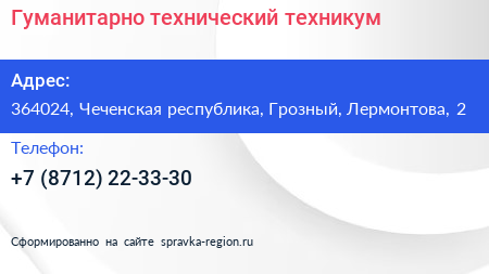 Гуманитарно-технический техникум по адресу 364024, Чеченская республика, Грозный, Лермонтова, 2 в дальнейшем Организация, размещена в следующих категориях: