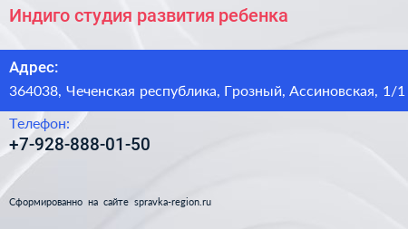 Индиго, студия развития ребенка по адресу 364038, Чеченская республика, Грозный, Ассиновская, 1/1 в дальнейшем Организация, размещена в следующих категориях: