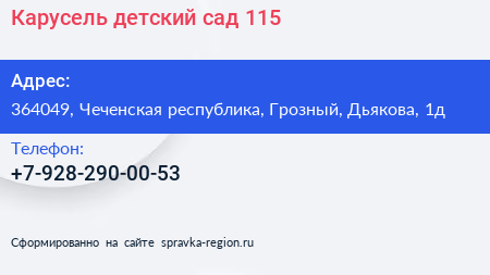 Карусель, детский сад №115 по адресу 364049, Чеченская республика, Грозный, Дьякова, 1д в дальнейшем Организация, размещена в следующих категориях: