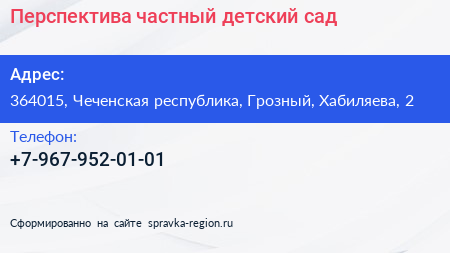 Перспектива, частный детский сад по адресу 364015, Чеченская республика, Грозный, Хабиляева, 2 в дальнейшем Организация, размещена в следующих категориях: