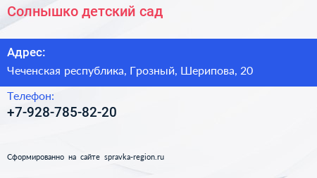 Солнышко, детский сад по адресу Чеченская республика, Грозный, Шерипова, 20 в дальнейшем Организация, размещена в следующих категориях: