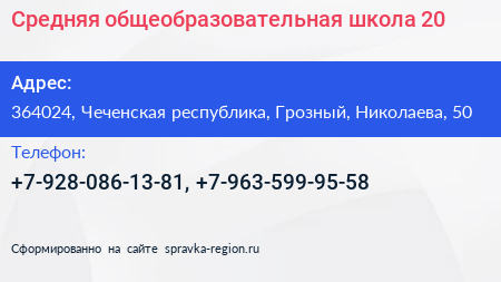 Средняя общеобразовательная школа №20 по адресу 364024, Чеченская республика, Грозный, Николаева, 50 в дальнейшем Организация, размещена в следующих категориях: