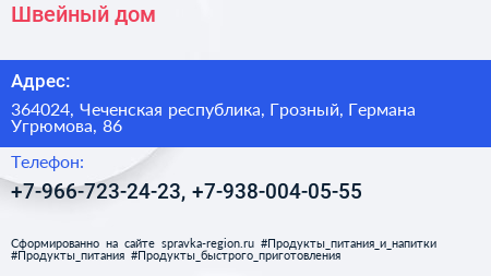 Швейный дом по адресу 364024, Чеченская республика, Грозный, Германа Угрюмова, 86 в дальнейшем Организация, размещена в следующих категориях: