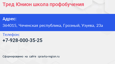 Тред-Юнион, школа профобучения по адресу 364015, Чеченская республика, Грозный, Узуева, 23а в дальнейшем Организация, размещена в следующих категориях: