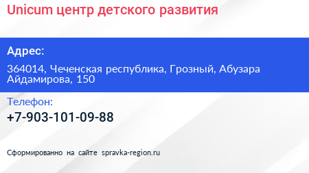 Unicum, центр детского развития по адресу 364014, Чеченская республика, Грозный, Абузара Айдамирова, 150 в дальнейшем Организация, размещена в следующих категориях: