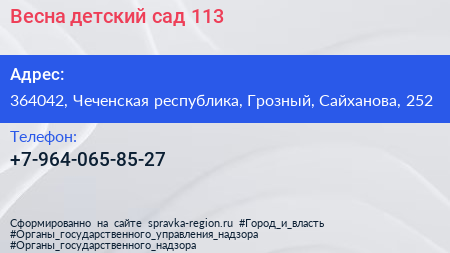 Весна, детский сад №113 по адресу 364042, Чеченская республика, Грозный, Сайханова, 252 в дальнейшем Организация, размещена в следующих категориях: