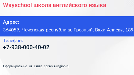 Wayschool, школа английского языка по адресу 364059, Чеченская республика, Грозный, Вахи Алиева, 189а в дальнейшем Организация, размещена в следующих категориях: