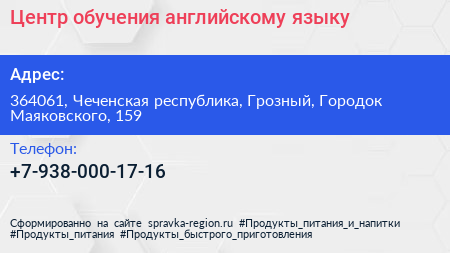 Центр обучения английскому языку по адресу 364061, Чеченская республика, Грозный, Городок Маяковского, 159 в дальнейшем Организация, размещена в следующих категориях: