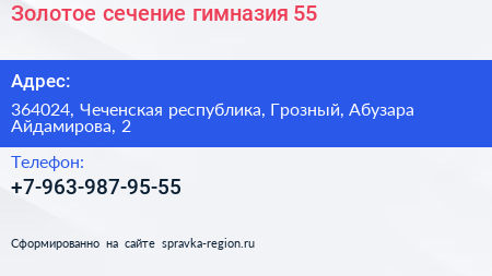 Золотое сечение, гимназия №55 по адресу 364024, Чеченская республика, Грозный, Абузара Айдамирова, 2 в дальнейшем Организация, размещена в следующих категориях: