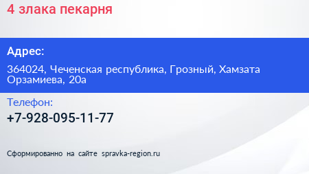4 злака, пекарня по адресу 364024, Чеченская республика, Грозный, Хамзата Орзамиева, 20а в дальнейшем Организация, размещена в следующих категориях: