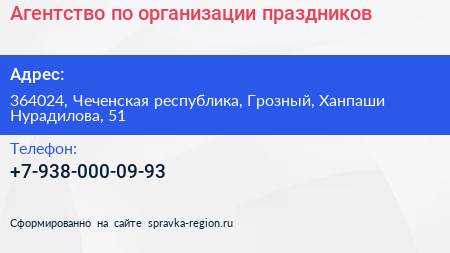 Агентство по организации праздников по адресу 364024, Чеченская республика, Грозный, Ханпаши Нурадилова, 51 в дальнейшем Организация, размещена в следующих категориях: