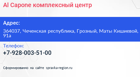 Al Capone, комплексный центр по адресу 364037, Чеченская республика, Грозный, Маты Кишиевой, 91а в дальнейшем Организация, размещена в следующих категориях: