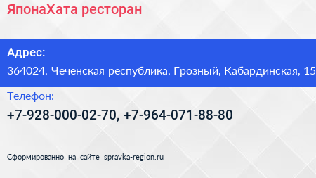 ЯпонаХата, ресторан по адресу 364024, Чеченская республика, Грозный, Кабардинская, 15 в дальнейшем Организация, размещена в следующих категориях: