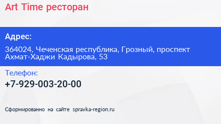 Art-Time, ресторан по адресу 364024, Чеченская республика, Грозный, проспект Ахмат-Хаджи Кадырова, 53 в дальнейшем Организация, размещена в следующих категориях:
