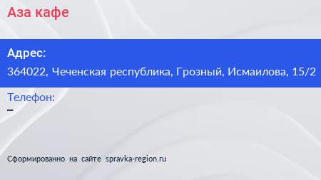 Аза, кафе по адресу 364022, Чеченская республика, Грозный, Исмаилова, 15/2 в дальнейшем Организация, размещена в следующих категориях: